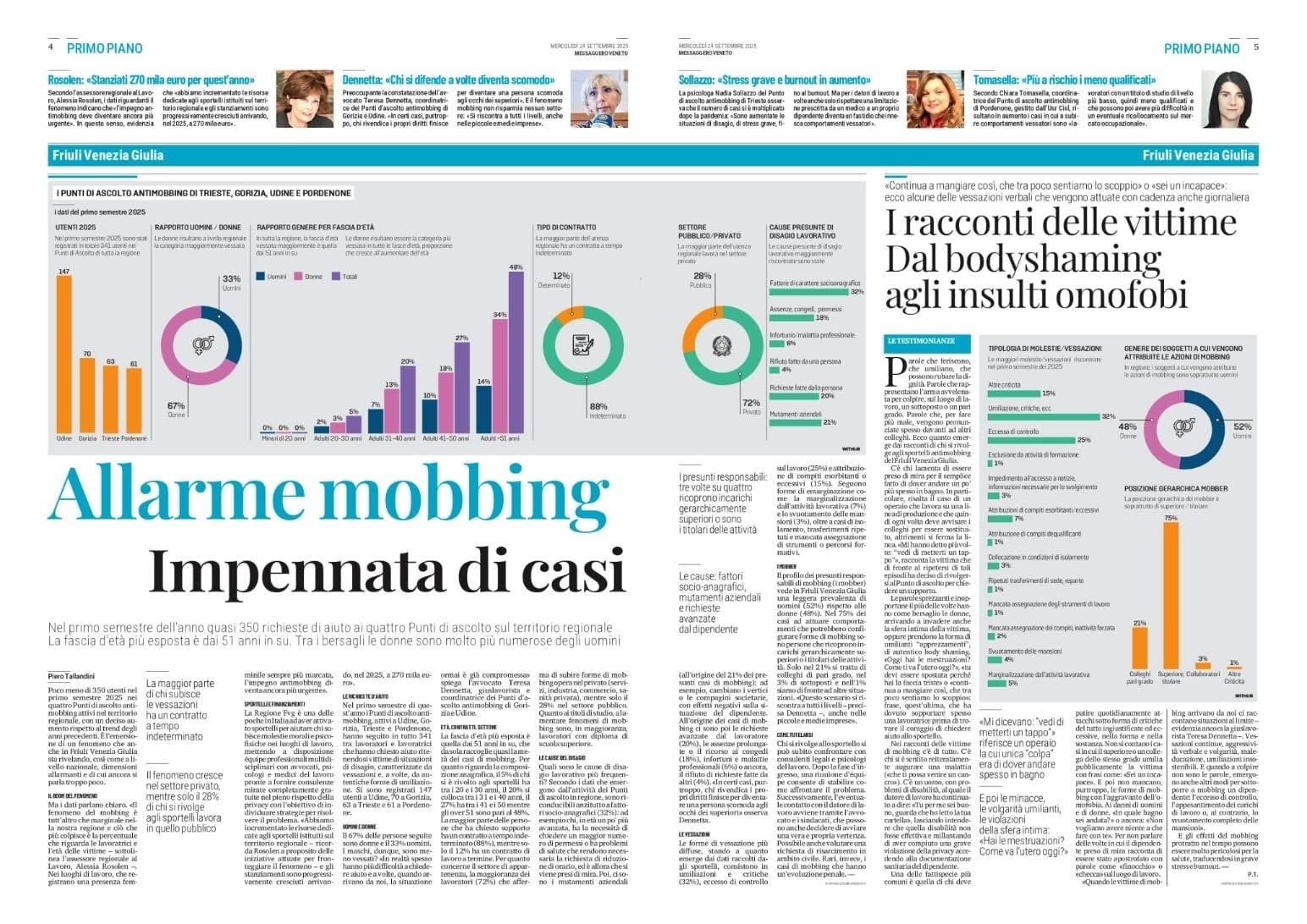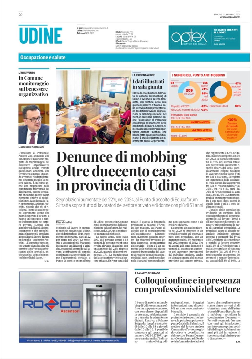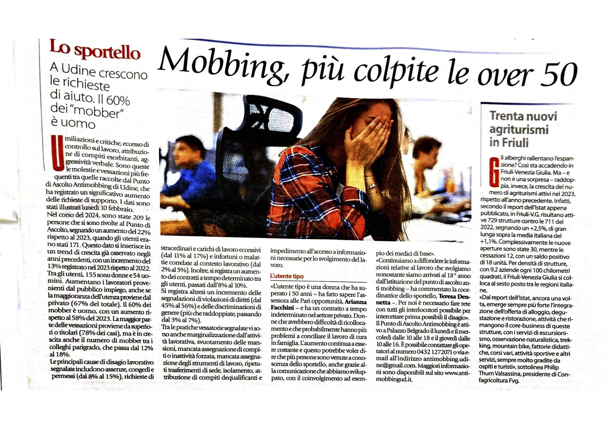 L’attività del Punto di Ascolto Antimobbing di Udine viene regolarmente seguita dai media locali e nazionali. In questa sezione raccogliamo articoli, interviste e servizi che raccontano il nostro impegno e l’importanza del servizio per il territorio.
